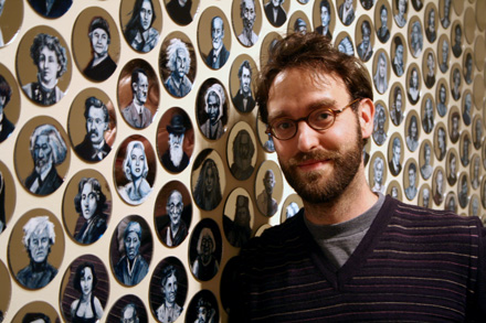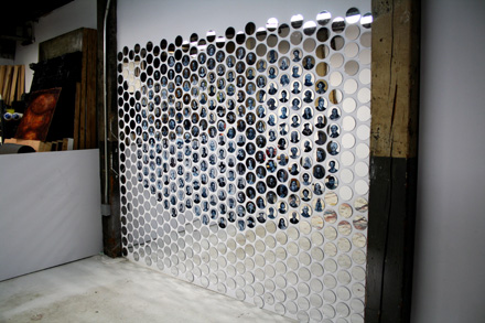 Jewel Net of Indra installation is a cosmology representing the interconnectedness of humanity. It is based on a Mahayana Buddhist metaphor of an infinite net of jewels, each representing an individual. Every jewel is a reflection of all others.  It was a wall installation with one thousand acrylic mirrored discs. Three hundred and twenty-five mirrors contained hand-painted miniature portraits of iconic individuals.  In 2012 I'm expanding the piece to 2000 portraits.