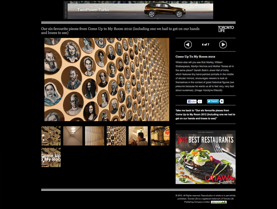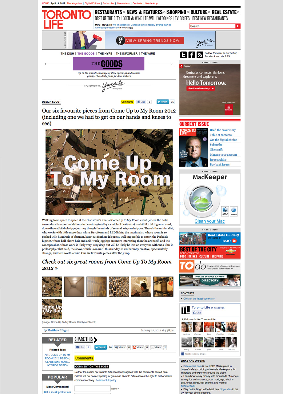 Walking from space to space at the Gladstone’s annual Come Up to My Room event (where the hotel surrenders its accommodations to be reimagined by a clutch of designers) is a bit like taking an absurd, down-the-rabbit-hole-type journey though the minds of several artsy archetypes. There’s the minimalist, who works with little more than white Styrofoam and LED lights; the maximalist, whose room is so packed with hundreds of abstract, laser-cut feathers it’s pretty well impossible to enter; the Parkdale hipster, whose half-shorn hair and acid-wash jeggings are more interesting than the art itself; and the conceptualist, whose work is likely very, very deep but will be likely be lost on everyone without a PhD in philosophy. That said, the show, which is on until this Sunday, is exuberantly creative, spectacularly strange, and well worth a visit. Our six favourite pieces after the jump.