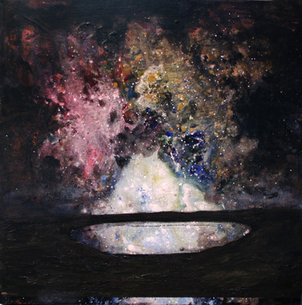 The exhibition features paintings of the vastness of space as if viewed from the earth. Essentially they are landscapes of the cosmos. The parallel subjects meld together, our world and the other. Rather than epic scale works, these paintings are intimate, yet they depict vastness and infinity.