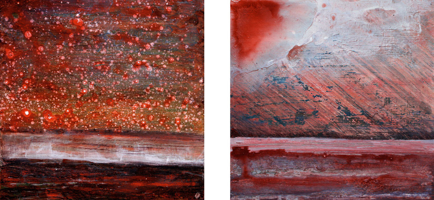 The Moments paintings depict vast open land beneath ominous stormy skies. These imagined landscapes have an intimate scale, only 8 to 10 inches square, yet they represent an epic space. Grouped together in sequences, they create a sense of shifting time and mood. The paintings depict the "spiritual" impact of the landscape, rather than its appearance. They embody human emotions and psychological states. Imagery emerges from flowing and pooling paint without reference to actual places.